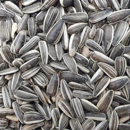 Die gestreiften Sonnenblumenkerne sind gereinigt und können ohne weitere Behandlung ins Futter gemischt werden.