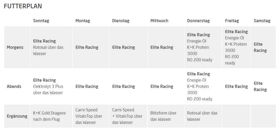 Mit Elite Racing wird die Taube in der Saison komplett versorgt. Das hochwertige Zucht- & Reisefutter besticht durch seinen extrem hohen Energiegehalt, der den Tauben während der Reise die nötige Power und Ausdauer verleiht. Dies gilt auch bei schweren und weiten Flügen!